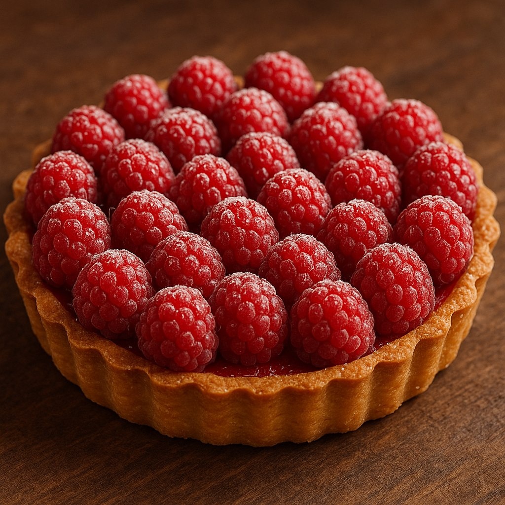 6. Собираем тарт: Когда корж готов, аккуратно покройте его заварным кремом. Украсьте свежей малиной и посыпьте сахарной пудрой для придания дополнительного шарма.