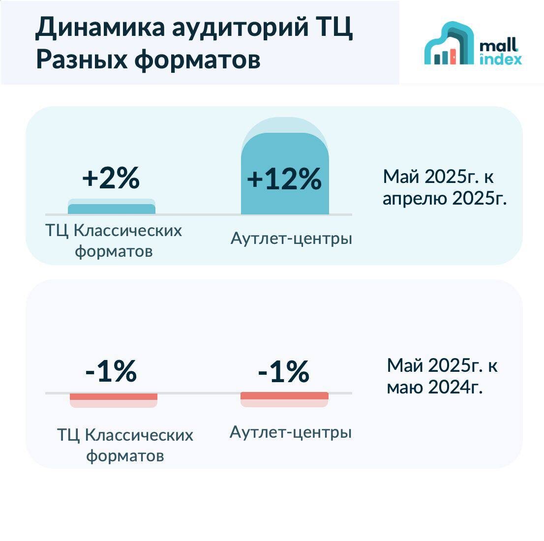 📊 Mall Index — май 2025 🏢 Классические ТЦ ➕ 2% к апрелю 2025 ➖ 1% к маю 2024 🛍️ Аутлеты ➕ 12% к апрелю 2025 ➖ 1% к маю 2024 💡 Рост активности потенциальных потребителей по сравнению с предыдущим месяцем зафиксирован в обоих сегментах. При этом аутлеты демонстрируют более высокую динамику, чем классические форматы. Отставание от прошлогодних значений остаётся умеренным в обоих сегментах. #mallindex #тц #аутлетцентры #посещаемость #аналитикарынка