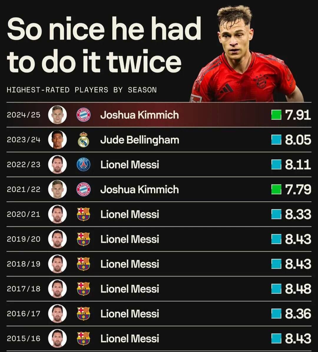 Киммих - лучший игрок в топ-5 лигах в сезоне 24/25 по средней оценке Sofascore📊