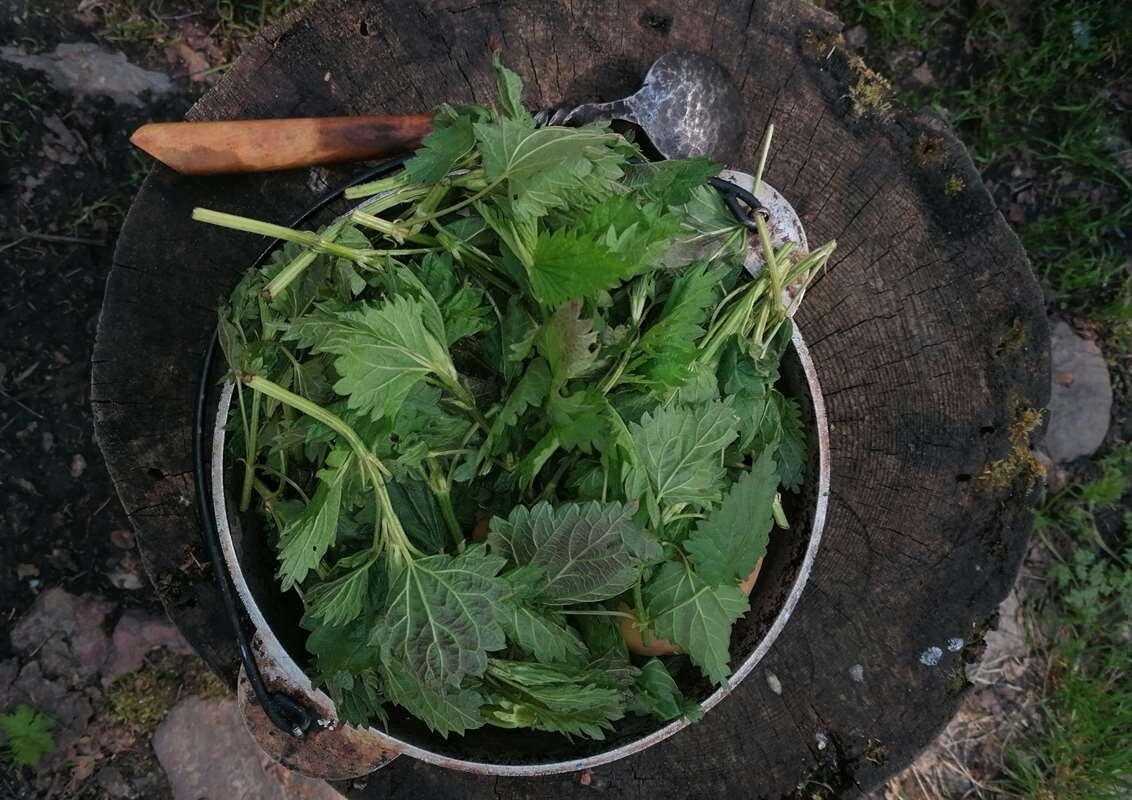 В беде и еде – помощница. Так говорят о зелёной жгучей траве русские народные поговорки Кладовые природы начинают нас радовать с самого начала весны. А хороших свойств крапивы не перечесть. Среди них и противовоспалительное и общеукрепляющее действие, стимуляция белкового и углеводного обмена в организме. И если вспомнить военные годы, то солдатская похлёбка точно не обходилась без листьев этой сочный травы с непростым характером. Поэтому предлагаю Вашему вниманию чудесный крапивный суп, который можно сварить в походе, предварительно взяв в рюкзак нужные и простые ингредиенты. Но обо всём по порядку. Начнём с того, что для приготовления супа нужно собрать молодую крапиву, которая весной и в начале лета особенно полезна. Я нашёл подходящее растение на чистой поляне. Самое главное: срезать листья необходимо аккуратно, лучше всего использовать перчатки, чтобы избежать ожогов. Не случайно и по-латыни крапива называется «urtica» – жгучая. Если в походе участвуют шесть человек, то листьев к