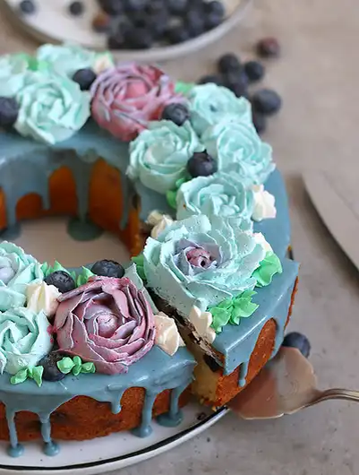 Если вы не знаете, какой торт приготовить на праздничный стол, то попробуйте приготовить этот лимонный торт с черникой и украшенный цветами из масляного крема. На первый взгляд может показаться, что приготовить такой торт сложно, но это не так. Попробуйте его приготовить и вы убедитесь в этом сами. Вот рецепт лимонного торта с черникой. Продукты необходимые для приготовления: Для торта: 325 г муки пшеничной 60 г крахмала 1/2 ч. л. соды 1/4 ч. л. соли 180 мл молока 60 мл лимонного сока 230 г размягченного сливочного масла 400 г сахара цедра двух лимонов натертая 5 яиц 2 ч. л. ванильного экстракта 200 г черники 1 ч. л. муки. Для масляного крема: 4 яичных белка 200 г сахара 1/4 ч. л. соли 290 г размягченного сливочного масла 1 ч. л. ванильного экстракта 130 г сахарной пудры Пищевой краситель (синий, зеленый, фиолетовый, розовый). Для глазури: 100 г сахарной пудры 1/2 ч. л. лимонного сока 1 ч. л. черничного соуса 1-3 ч. л. сливок (по желанию). Несколько ягод черники для украшения. Время пр