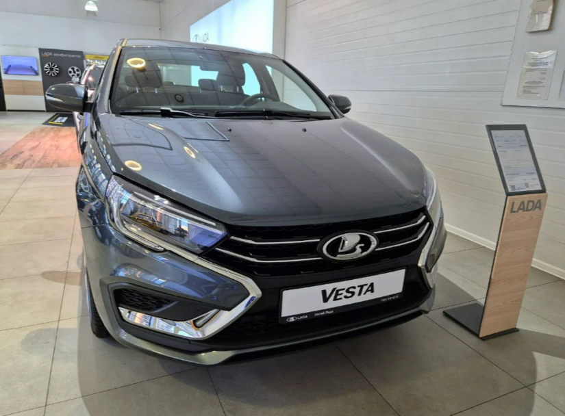 Самая бюджетная Веста из выставленных в шоу-рум, это седан серого цвета в комплектации Life. Мотор 1,8 л, 122 л. с., коробка вариатор. Год выпуска 24. Колёсные диски стальные 15, передняя и задняя оптика светодиодная. В оснащение входит две подушки безопасности, ABS, ESP, задние дисковые тормоза, бесключевой запуск двигателя, передний центральный подлокотник, кондиционер, передние и задние электростеклоподъёмники, мультимедийная система, мультимедийный руль, четыре подголовника, бортовой компьютер, электроусилитель, центральный замок, подогрев передних сидений, четыре динамика, подогрев и электрорегулировка зеркал.