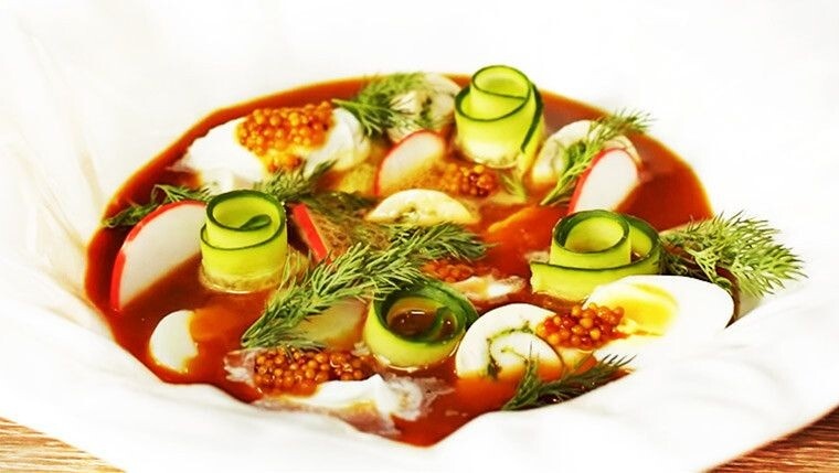 Ингредиенты: 🔹Картофель - 1 шт. 🔹Редиска - 3 шт. 🔹Огурец (длинноплодный) - 1 шт. 🔹Яйца перепелиные - 6 шт. 🔹Укроп - 5 г 🔹Горчица зерновая - 40 г 🔹Квас - 450 мл 🔹Сметана - 3 ст. л. 🔹Куриная грудка - 250 г 🔹Чеснок - 2 зубчика 🔹Петрушка - 1 пучок (15 г) 🔹Растительное масло (подсолнечное) - 20 мл 🔹Соль, перец - по вкусу 🔹Квас - 100 мл 🔹Горчица обыкновенная - 2 ч. л. 🔹Сахар - 1 ч. л. 🔹Яблочный уксус - 1 ч. л. 🔹Соль - по вкусу Приготовление пошагово: 1️⃣Куриную грудку разрезать вдоль на 3 слайса, переложить каждый слайс на пищевую плёнку и покрыть сверху, отбить молотком плоской стороной двигаясь от центра слайса к краям. 2️⃣Каждый слайс отбитой грудки поперчить и посолить по вкусу. 3️⃣2 зубчика чеснока, петрушку вместе с веточками, влить 20 мл растительного масла и перебить блендером. 4️⃣Каждый слайс смазать с одной стороны полученной зелёной массой, с помощью пищевой плёнки скрутить слайсы в рулетики и подкрутить края, как фантик у конфеты. 5️⃣Отправить 3 рулетика в пи