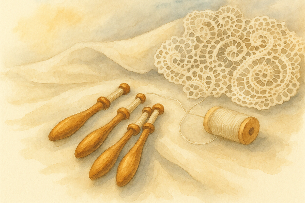 Считается, что технику привезли мастера из Москвы и Нижнего Новгорода, но именно в Вологде кружево обрело свой узнаваемый стиль — геометричность, крупный узор, строгость линий. Это не вышивка. Настоящее вологодское кружево — это плетение с помощью коклюшек (небольших деревянных катушек) по бумажной сколке.