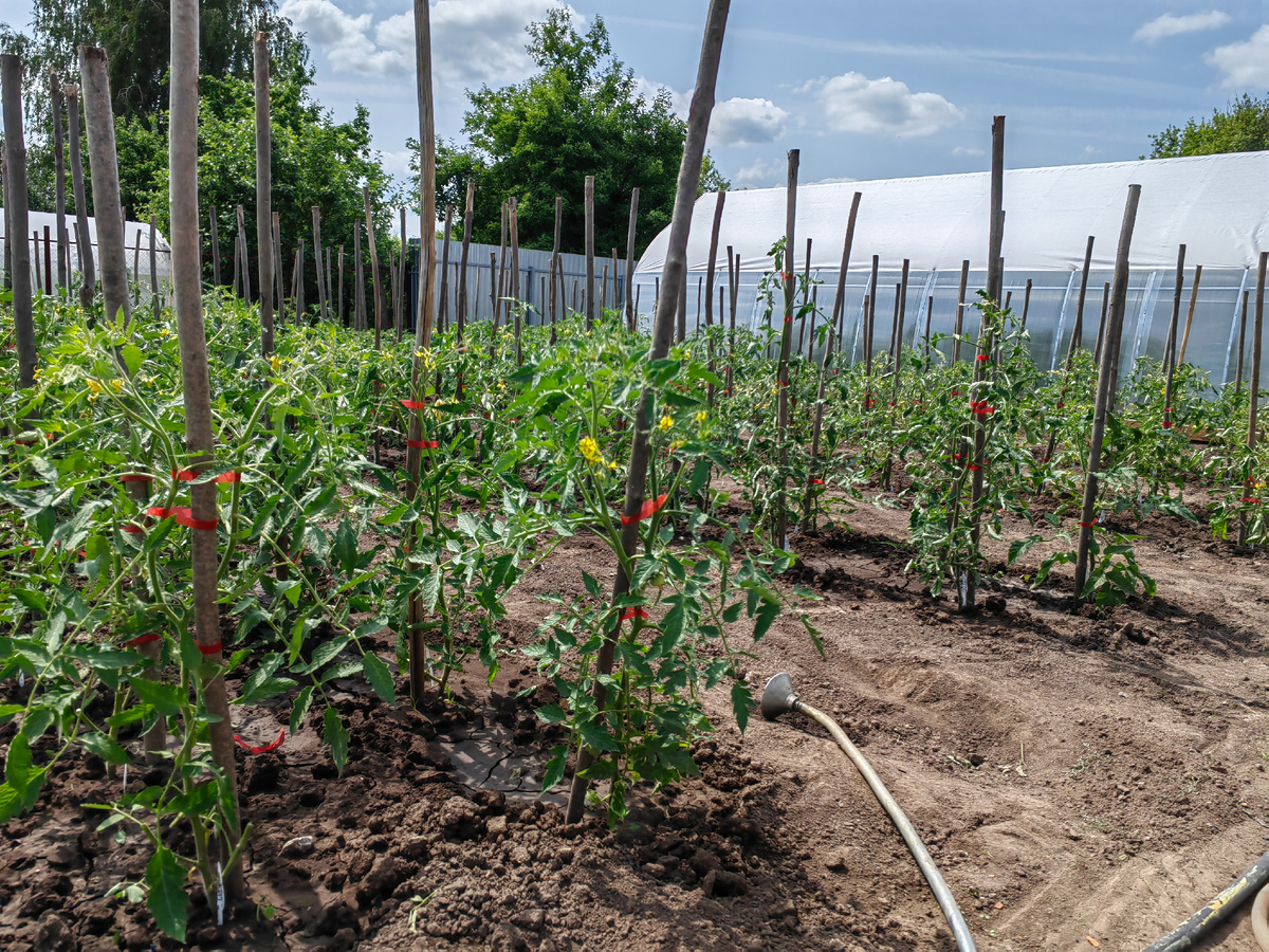 Как всегда ничего не успеваю вам вовремя рассказывать. Вчера закончили работу по разборке каркасов. Убирали плёнку, разбирали каркасы, в один день нужно было всё отпасынковать и подвязать к колышкам. С 6 июня начали разбирать и только вчера всё доделали. У нас 7 июля был сильный ливень, весь огород стоял в воде, потом еще пару дней с небольшим дождем. Обычно стараюсь сразу, как уберу пленку, опрыснуть фунгицидом Ордан, но из-за погоды смогла это сделать лишь вчера. Огурцы тоже опрыснула Орданом. Ещё сорняки замучили, каждый день бегаю по огороду с тяпкой, а их меньше не становится. Больше всего раздражают осот и вьюнок, их корневища размножились по всему огороду. В теплице я ещё не все стебли успела подвязать, ведь планировала высокорослые вести в 1 стебель, но как всегда не выдержала и оставила почти всем второй стебель, вот уже несколько дней между основной работой пытаюсь подвязать все вторые стебли. И конечно же удаляю пасынки. Томаты в теплице слегка жируют, но ничего страшно