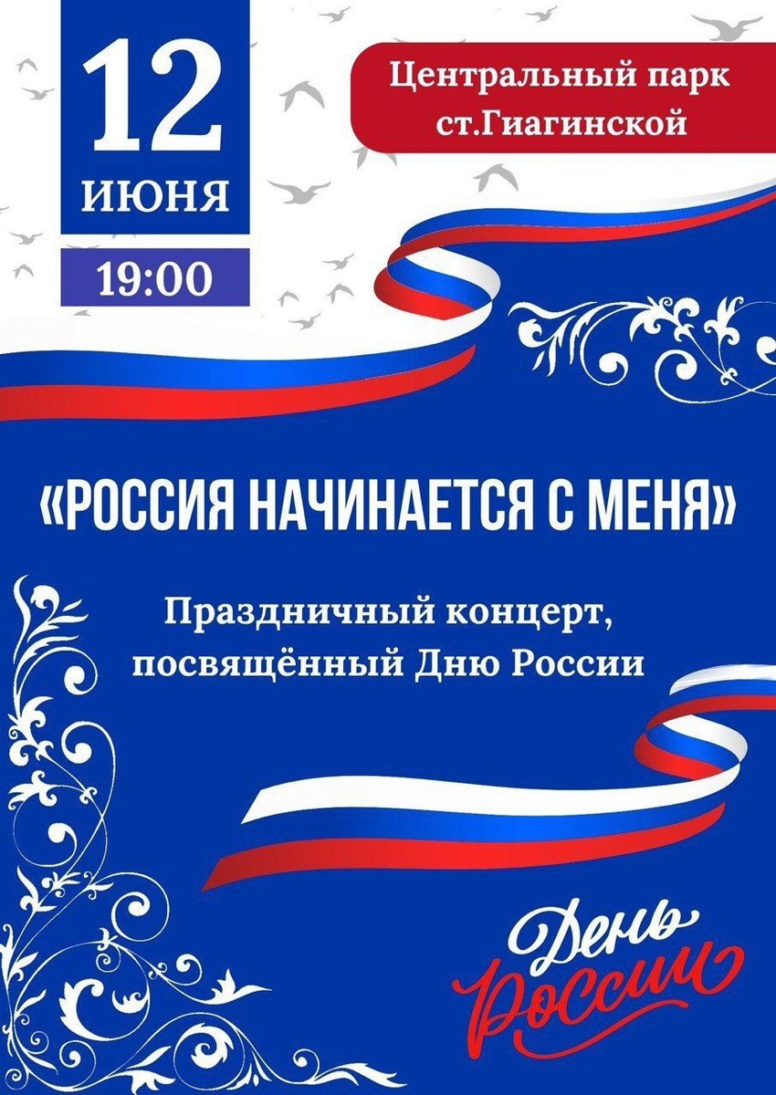Приближается один из самых важных государственных праздников, который объединяет многонациональное население Российской Федерации 🇷🇺 12 июня Центральный парк станицы Гиагинской 19:00 праздничный концерт, посвященный Дню России🇷🇺