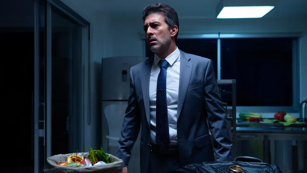 Включил свет и замер от сюрприза. То, что жена оставила... Посреди стола стояло мусорное ведро, вокруг пустые тарелки, кастрюли — всё, что было в холодильнике, в ведре лежит горкой. А сверху записочка: «Травить больше тебя не буду. Питайся правильно и с пользой». И колечко обручальное сверху всей этой композиции, чтобы наверняка было понятно, что доигрался.