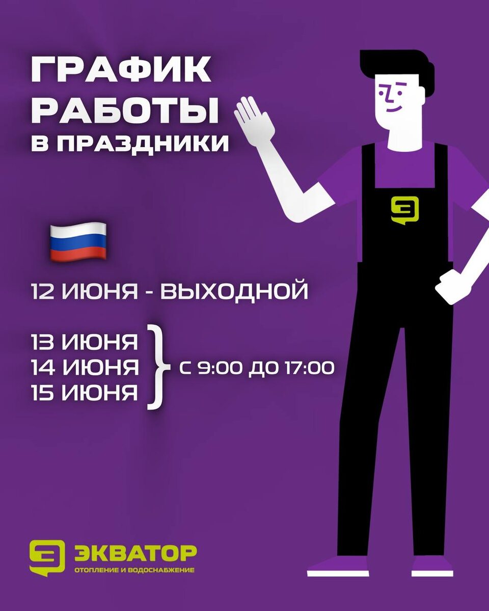 Уважаемые клиенты, обратите внимание, в праздничные дни изменен график работы магазинов Экватор 🇷🇺 12 июня - выходной 13/14/15 июня - с 9:00 до 17:00 Всех с наступающим Днём России! 🥳🇷🇺