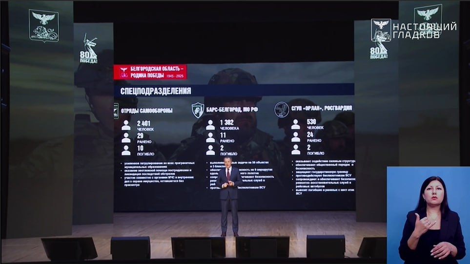 14 бойцов белгородских спецподразделений погибли в 2024 году Всего в самообороне, «БАРСе-Белгород» и «Орлане» состоят 4233 бойца. Люди, выбравшие мирную профессию, взяли в руки оружие и пошли защищать родную землю – за это им отдельная благодарность, подчеркнул губернатор. «Я благодарен всем бойцам всех воинских подразделений самообороны, «БАРСа» и «Орлана» за тот пример, который вы подаёте нашим детям и внукам. Каждый из вас является героическим примером для будущих поколений. Благодаря вашему мужеству, не устану это повторять, всё ещё продолжает существовать, развиваться и процветать наша любимая Белгородская область», – отметил Вячеслав Гладков. Также глава региона поблагодарил Минобороны и сотрудников силовых ведомств – «всех тех, кто выбрал профессию защищать Родину и сейчас стоит в первом ряду на борьбе с врагом». Подписаться на нас|Предложить новость