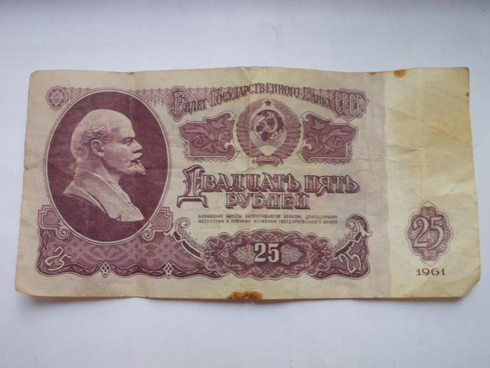 Вспомнилось случайно. Где-то плюс-минус в середине или ближе к концу 80-х гг. в возрасте конца детского сада либо 1-2 класса школы, идя по улице, я нашёл интересную фиолетовую бумажку с цифрами 25. Вот такую: Не, я понимал, что это деньги, но суммы не понимал. Это были те времена (более развитой цивилизации), когда булка хлеба стоила в районе 20 копеек, лимонад в районе 25 копеек (хотя мы обычно его получали бесплатно, вернее, за сдачу бутылок или макулатуры), 1 кг мяса около 2 рублей и т.д. Я тогда, по-поему, даже не видел банкноты свыше 3-5 рублей. Основные "мои" деньги были копейками, самые дорогие покупки - хлеб, молоко, лимонад, т.е. в районе тех самых 20-30 копеек. И то ли мою находку увидел какой-то старший пацан (не с нашего двора, потому что я его совершенно не помню), то ли я сам похвастался, но пацан предложил мне купить у него какие-то игрушки. И я купил. Что-то типа пары солдатиков и машинку. Сейчас я думаю, что всё это стоило в районе одного рубля, максимум двух. И я ещё