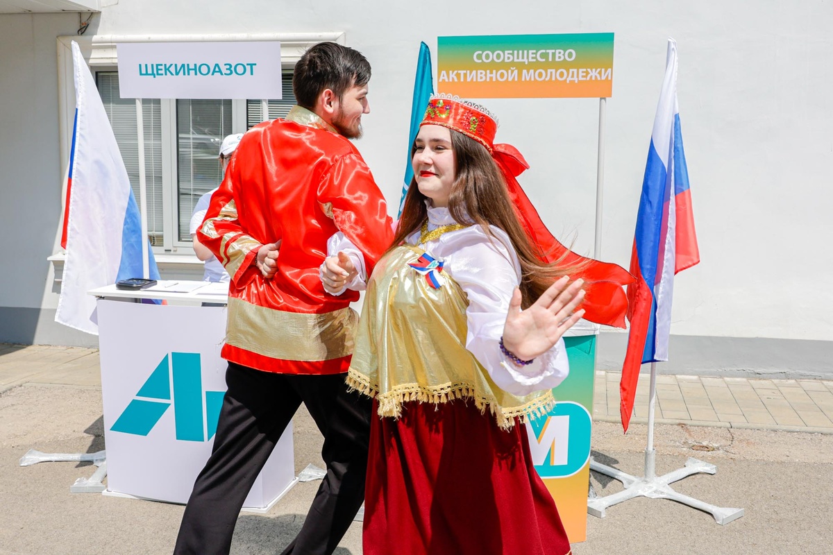 Перед главным государственным праздником – Днем России – на «Щекиноазоте» царит особенная атмосфера! Сегодня на площадке возле столовой у Центральной проходной состоялась яркая интерактивная программа, посвященная этому событию. ✨ Гостей встречали активисты Сообщества активной молодежи в колоритных русских народных костюмах. Руководитель группы по развитию молодежной политики Елизавета Заломова и оператор ДПУ 6 разряда производства АиК Александр Моховиков создавали праздничное настроение и вовлекали коллег в увлекательные конкурсы и викторины. На площадке царил дух радости и единения. Одним из самых зрелищных стал конкурс «Силушка богатырская», где наши сильные духом и телом парни соревновались в выжимании электронного эспандера, демонстрируя свою отличную физическую форму! Не менее интересным оказался конкурс «Коса-краса», где участницы проверяли себя в скорости и аккуратности плетения традиционной косы «русской девицы» на манекене. Под дружные аплодисменты и подбадривающие слова веду