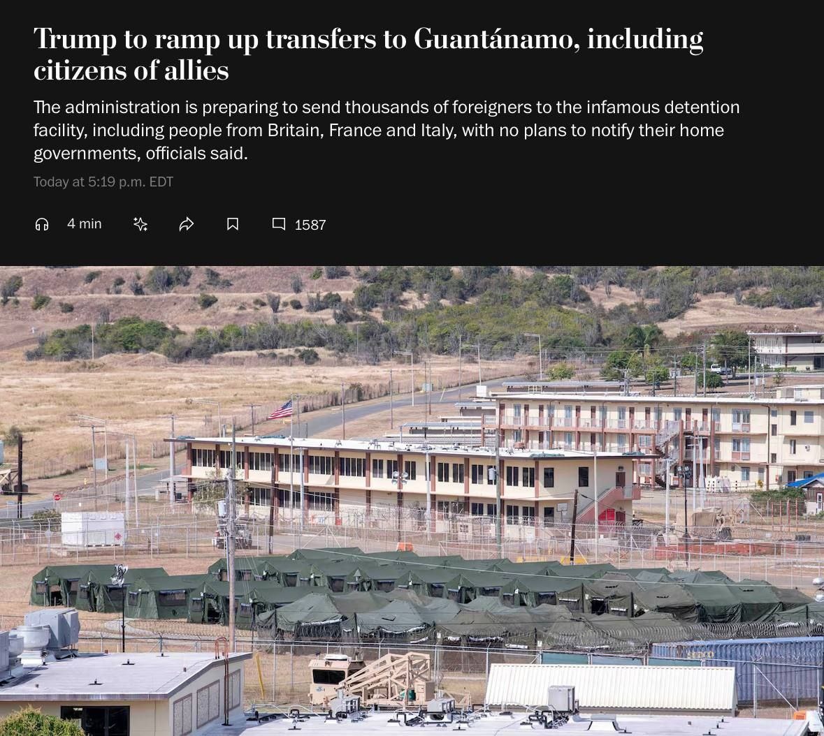 Администрация Трампа тайно отправит в тюрьму в Гуантанамо тысячи мигрантов, включая украинцев, - WP Уже на этой неделе готовится перемещение 9000 тысяч иностранцев, незаконно находящихся в США. Trump-Regierung schickt heimlich Tausende Migranten, darunter Ukrainer, nach Guantanamo Bay – WP 9.000 illegale Einwanderer in den USA werden diese Woche auf ihre Umsiedlung vorbereitet.