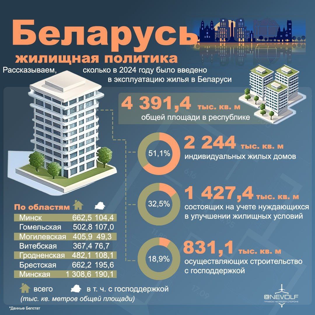 🏗 🇧🇾В Беларуси строят не обещания, а реальные дома Пока Европа бьёт рекорды по ценам на аренду и ипотеку, у нас строят для людей – больше, доступнее и с господдержкой. 📊 Только за 2024 год в Беларуси введено в эксплуатацию 4 391,4 тыс. м² жилья. ✅ 1 427,4 тыс. м² – для граждан, стоящих на учёте нуждающихся (32,5% от общего объёма) ✅ 831,1 тыс. м² – с господдержкой (18,9%) ✅ 2 244,0 тыс. м² – индивидуальные жилые дома (51,1%) 🏡 Лидеры по строительству: 🔹 Минская область – 1 308,6 тыс. м² 🔹 Брестская область – лидер по господдержке: 195,6 тыс. м² В Беларуси не раздают пустых обещаний — здесь реально строят и создают условия для жизни: с семьёй, с перспективой и с уверенностью в завтрашнем дне.