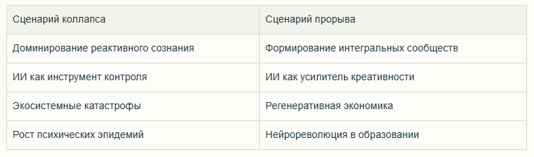 «Человечество оказалось в точке бифуркации — зоне активного хаоса, где старые паттерны рушатся, а новые ещё не сформированы. Возврат к прошлому невозможен: как только сознание расширяется, оно не может сжаться до прежних границ. Наш выбор — трансформация или стагнация в иллюзии контроля» (Великая Матрица, гл. 7). Согласно интегральной модели сознания, мы переживаем кризис пятого уровня — момент, когда социальные институты, технологии и экосистемы синхронно выходят из равновесия. Это не случайность, а закономерный этап эволюции: Попытки вернуться в «зону комфорта» через ностальгию по прошлому — иллюзия. Как показано в Великой Матрице, сознание развивается по спирали: каждая новая витка требует пересборки всех элементов системы. Эволюция нелинейна. Современный кризис — следствие накопления смысловой энтропии, когда: В таких условиях стратегии выживания, основанные на реактивности («бей/беги»), только усиливают хаос. Великая Матрица предлагает переход к проактивному сознанию — системе, г