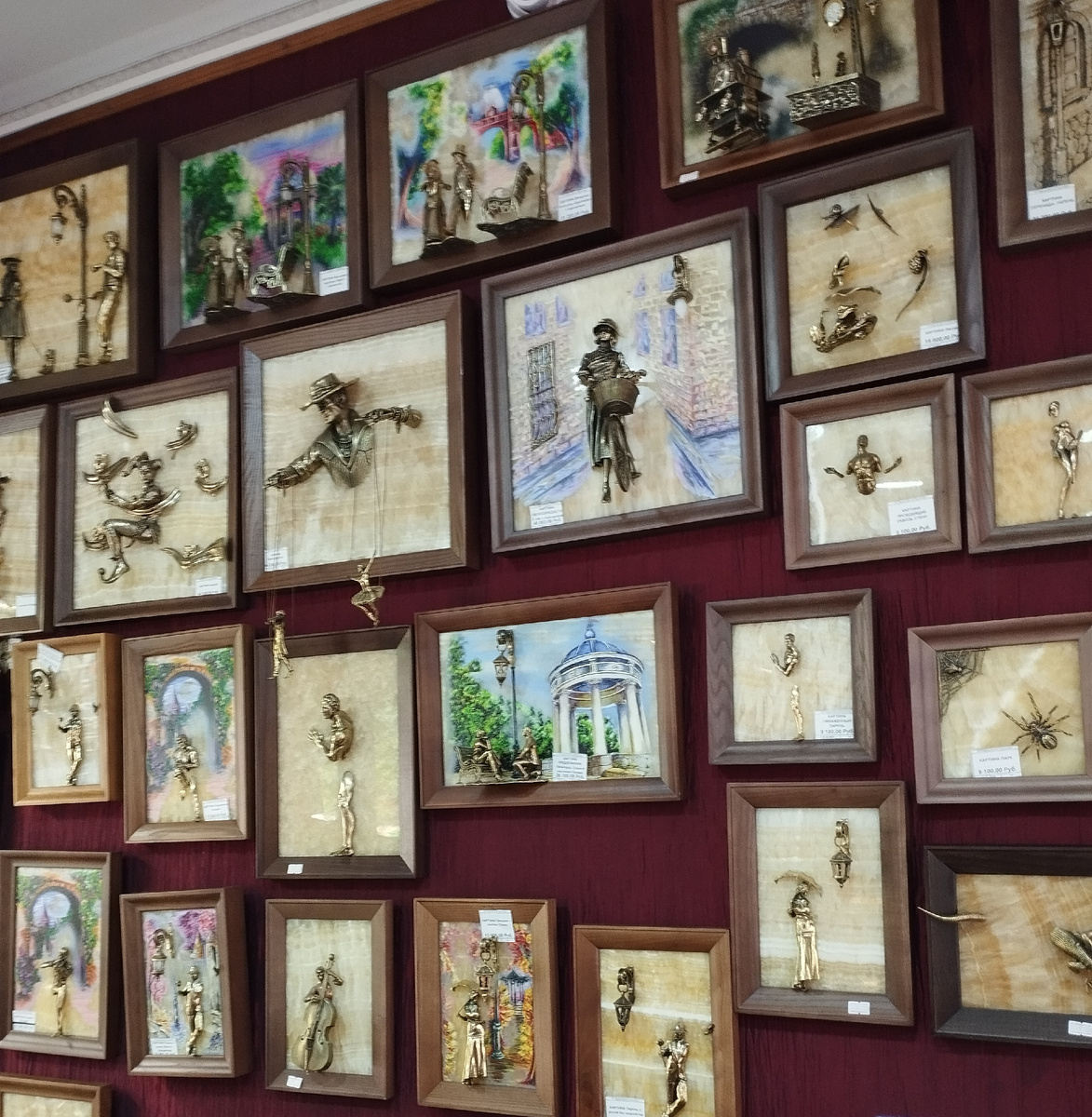 Маленький курортный Железноводск, полюбившийся мне в прошлом году: неожиданно много всего очень интересного предлагает в качестве сувениров, которые можно привезти для себя, для родных, друзей и коллег. Расскажу лишь о некоторых вариантах. На фото необычный вариант. Это изделия мастеров из Пятигорска. Они делают вот такие удивительные картины из полупрозрачного оникса и традиционной бронзы. В этом же маленьком магазине можно купить множество других сувениров. Они в Железноводске продаются повсюду. Травяные чаи и лекарственные сборы, приправы и всякие чудодейственные средства. Насколько всё это действенно? В прошлом году желудочный сбор получила в подарок моя знакомая в Донецке. В нынешнем она попросила привезти ещё. Говорит, на самом деле помогает. Ну, а я для себя покупаю вот такие травяные чаи. А ещё стоит обратить внимание на произведения местных мастеров. В особенности вот такие. Всё это не краски, а ленты. И созданы эти картины без использования клея. Поразительное мастерство,