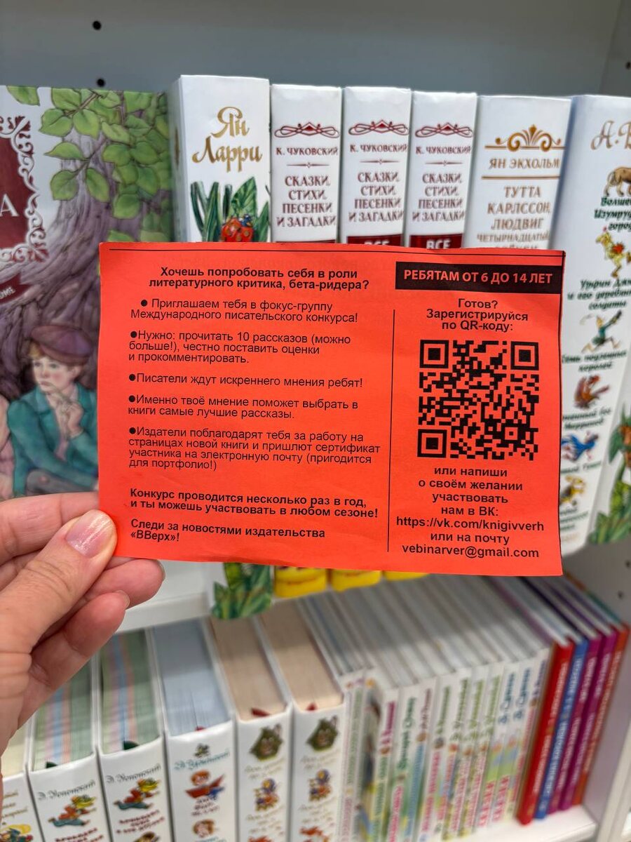 #книжки_для_детишки 💫 ДЛЯ КНИГОЛЮБОВ-ДЕТЕЙ И ИХ РОДИТЕЛЕЙ 🔠тголоски прошедшего нон-фикшена меня не отпускают, потому что я вновь встретилась с этим классным издательством «ВВерх!», уже написала своим подружкам с подрощенными детьми, и тут меня осенило, что вообще-то могу и буду делиться и с вами. Не все же тут молодые матери грудничков 😜 📚 Суть этого издательства в том, что оно публикает те рассказы/истории/романы для детей, которые выбирают… сами дети! 📚 То есть у ребят от 6 до 14 лет есть возможность выступить в роли бета-ридера и почувствовать уровень собственной значимости 😊 Бета-ридер — это тот, кто по просьбе автора (или переводчика) читает текст перед его передачей для публикации и посылает автору отклик о прочитанном с позиций рядового читателя. 📚 Итак, нужно отправить заявку — можно в ВК, можно по почте (все указано в буклете), указать возраст и ждать, когда пришлют ответ. Честно делиться своим мнением и даже можно пожеланиями к произведению. 📒 Я сама очень жду