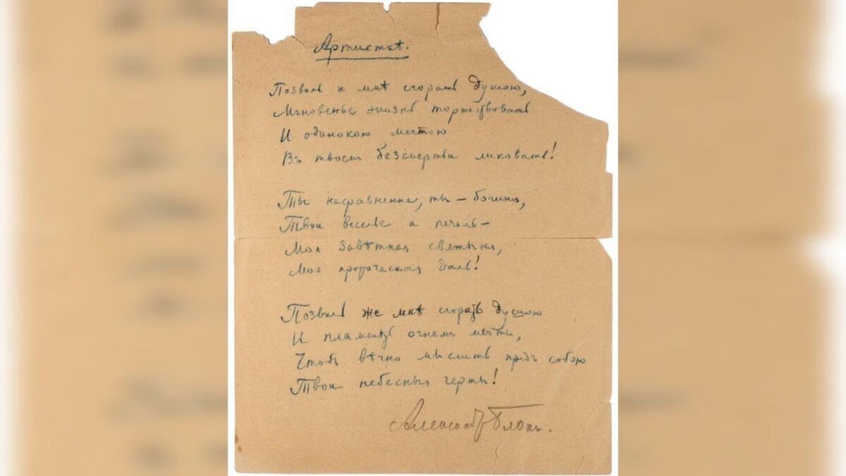 Рукопись поэта Серебряного века Александра Блока представили на торгах в Петербурге. Ее стоимость оценивают в 1,6 млн рублей, сказано на сайте аукционного дома «Литфонд». Эксперты подтвердили подлинность записи стихотворения «Артистке», написанной рукой литератора и его автографом. Предположительно, рукопись датируется 1915-1916 годами. «Сравнительный анализ представленного автографа стихотворения «Артистке» с автографами стихотворений А. Блока 1915-1916 гг. показал совпадение почерка по всем характеристикам: графика отдельных букв, наклон почерка, особенности соединения букв, интервал между строками», – говорится в описании лота. Там же сказано, что рукопись представляет коллекционную ценность музейного уровня. Прием заочных ставок на участие в аукционе закончится через неделю. Их будут принимать до 17 часов 19 июня 2025 года. Также на торги выставили четвертый сборник стихов «Ночные часы», подписанный Блоком. Его стартовая стоимость оценивается в 8 тысяч рублей. Ранее «Петербургский