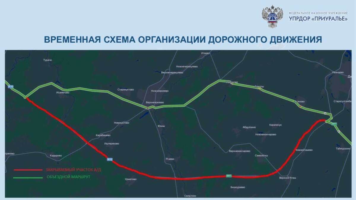 ... ФКУ Упрдор «Приуралье» сообщает, что на участке трассы М-7 «Волга» в обход населенных пунктов Исаметово, Верхнеяркеево, Лаяшты, Ишкарово и Асяново Республики Башкортостан закрыто движение автотранспорта предварительно до 17:00 (время местное) 16.07.2025 в связи с проведением работ по установке автоматизированной системы управления дорожным движением (АСУДД) и системы взимания платы (СВП).