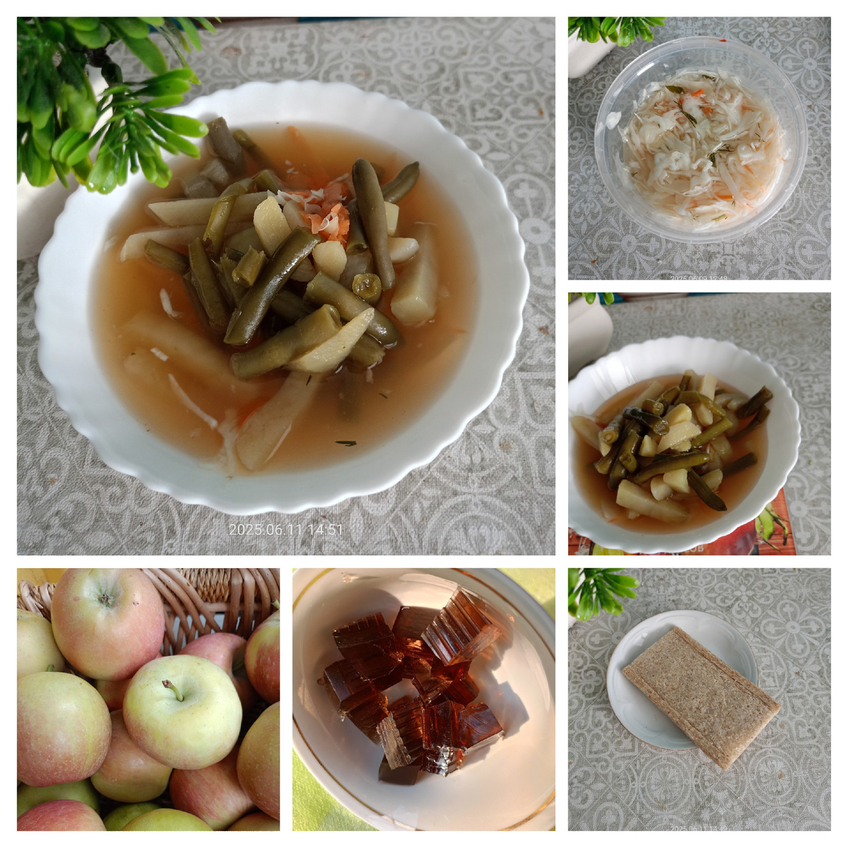 Ужин - рыбный суп со стручковой фасолью; квашеная капуста.