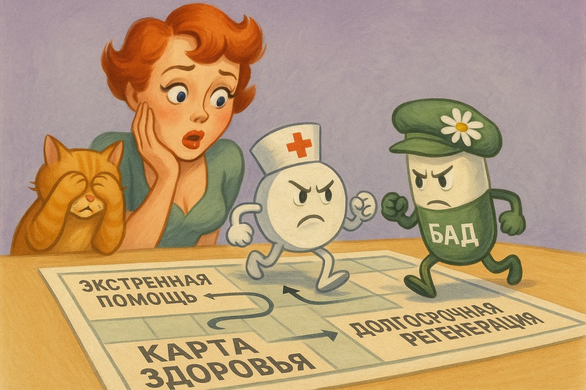Народ разделился на два лагеря: Одни пьют таблетки, потому что «доказано и быстро». Другие — БАДы, потому что «натурально и мягко». А истина — где-то посередине. РАЗНИЦА В МИССИИ: КТО ЗАЧЕМ ПРИШЁЛ? Лекарственные препараты (по определению ВОЗ) — это вещества, модифицирующие физиологические функции. Они вмешиваются, управляют, блокируют, стимулируют, тормозят. Примеры: – Ибупрофен тормозит ЦОГ-2, снижая воспаление, боль, температуру. – Амлодипин расслабляет сосуды и, соответственно, снижает артериальное давление. – Омепразол выключает выработку желудочной кислоты, что облегчает такие симптомы, как изжога, отрыжка, тяжесть в желудке. Это острая тактика! Таблетка выключает симптомы — быстро, резко. Можно сравнить с пожарным: пришёл, обеспечил доступ к очагу, всё залил и ушёл. А ЧТО ДЕЛАЮТ БАДы? БАДы (биологически активные добавки) — не лечат. Они не вмешиваются, а дают стройматериалы: аминокислоты, минералы, витамины, жирные кислоты — вещества, необходимые для запуска естественных реакц