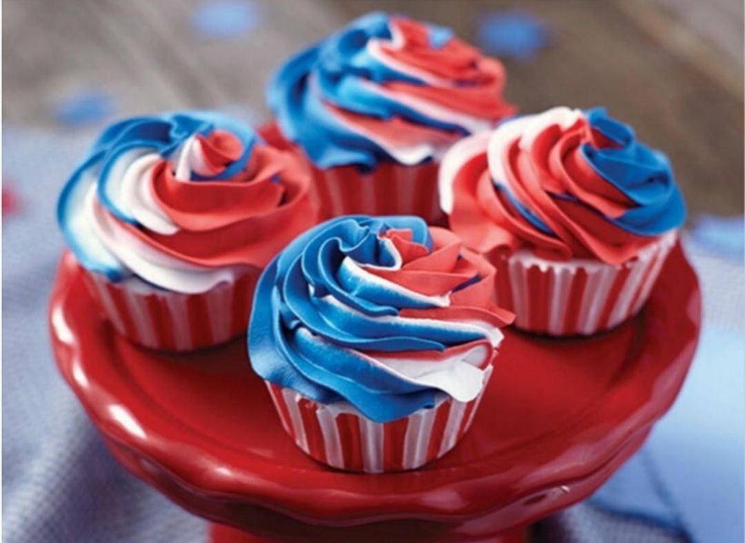 4. Наполните кондитерский мешок кремом одного цвета (например, красным – он будет снизу) и нанесите этот крем сразу на все маффины. Далее очередь синего крема – так же, поверх красного, на все кексы. Завершающим слоем будет белый.