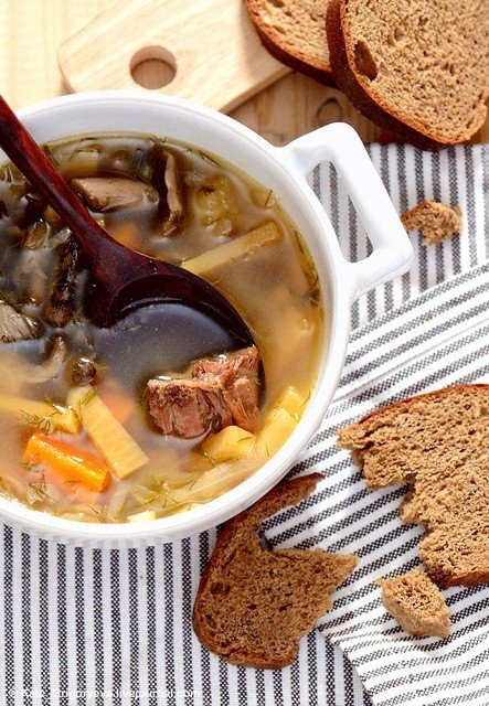 5. Когда вода закипит, грибы вынимаем, нарезаем соломкой и опускаем в грибной бульон довариваться. После готовности грибов и картофеля соединяем их с мясным бульоном.