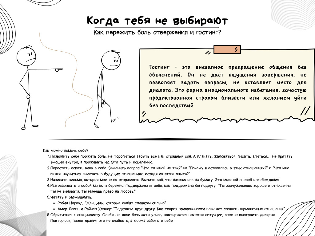 Гостинг - это внезапное прекращение общения без объяснений. Он не даёт ощущения завершения, не позволяет задать вопросы, не оставляет место для диалога. Это форма эмоционального избегания, зачастую продиктованная страхом близости или желанием уйти без последствий. Но на том конце остаётся живой человек, который переживает всё как реальную потерю.