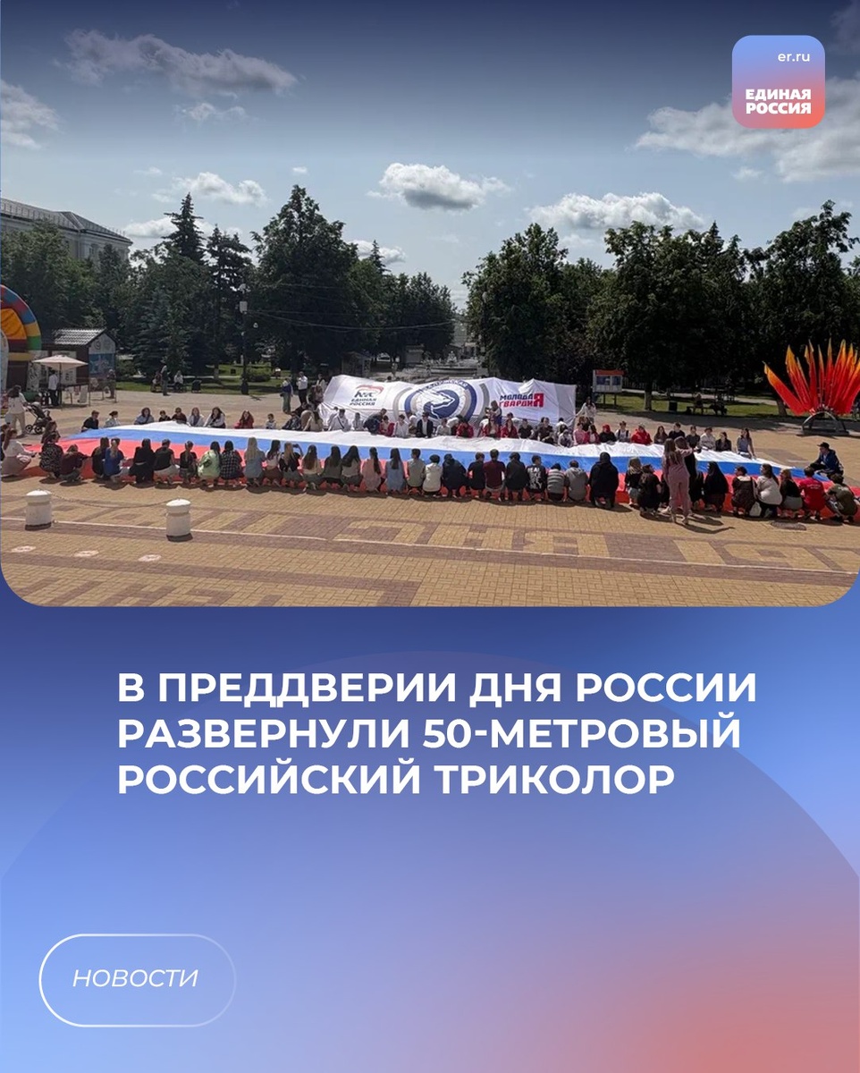 Активисты «Молодой Гвардии» и «Волонтерской Роты» развернули 50-метровый российский триколор 🇷🇺Флешмоб организовали на Театральной площади Калуги в преддверии Дня России, сообщает региональное отделение партии «Единая Россия». В нём приняли участие представители «Молодежки Народного Фронта», а также высших и среднеспециальных учебных заведений. Более 150 человек развернули 50-метровый российский флаг и спели вместе патриотические песни. Мероприятие состоялось при поддержке партии «Единая Россия». К активистам присоединились руководитель исполкома партии Алексей Максименко, депутат Износковского районного собрания Антон Козлов и участник СВО, кавалер ордена Мужества Артур Титов. «Ребята, наша молодежь, должны быть настоящими патриотами своей страны. И эти мероприятия направлены, как раз, на то, чтобы они понимали, что они русские, что они выросли в России и должны гордиться своей страной!», — отметил Артур Титов. #ЕР40 #ДеньРоссии