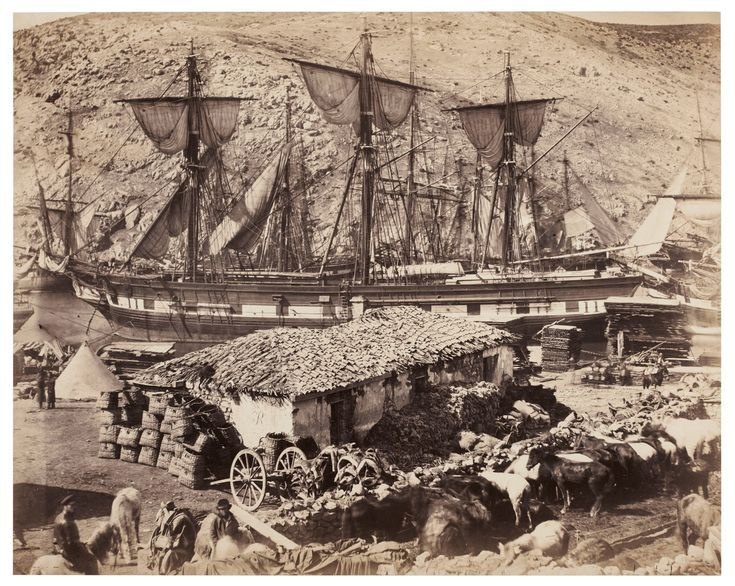 Гавань Балаклавы. "Скотоводческий причал". Март 1855 года. Авто фото: Роджер Фентон (The Harbour of Balaklava, the Cattle Pier». Roger Fenton) На снимке изображена сцена в порту Балаклавы, где видны различные элементы, отражающие историческую обстановку того времени. Некоторые детали изображения: У причала стоит парусный корабль с несколькими мачтами и сложенными парусами. На пирсе видны товары и товары, а также крытое сооружение, возможно, для хранения или укрытия. На переднем плане видны различные фигуры: торговцы, моряки или докеры. Рядом с пирсом собрана группа скота, возможно, только что выгруженного с корабля или ожидающего погрузки. С правой стороны стоит телега, вероятно, для перевозки товаров, и рядом с ней разбросаны несколько сложенных бочек. На фоне — сухой холмистый ландшафт, характерный для прибрежного региона вокруг Балаклавы, расположенной на Крымском полуострове. #Балаклава #Севастополь #КрымскаяВойна #транспорт #флот