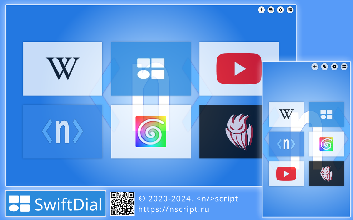 SwiftDial — современная, легко настраиваемая домашняя страница | новая вкладка | экспресс-панель для вашего браузера, уважающая вашу конфиденциальность. Ваши настройки и сайты хранятся на вашем устройстве и никуда не пересылаются. При помощи панелей и меню SwiftDial вы можете управлять домашней страницей и использовать ее функции. Главное меню SwiftDial при помощи панели «Общие настройки» можно расположить: В зависимости от выбранных вами настроек, основные кнопки главного меню могут находиться: Контекстные меню открываются нажатием правой кнопки мыши (или долгим нажатием для сенсорных устройств) на определенном объекте домашней страницы, либо на самой домашней странице. Панели можно открыть нажатием на соответствующие им пункты главного меню домашней страницы, других панелей или контекстных меню, а также с помощью горячих клавиш для клавиатуры, информацию о которых вы сможете найти в разделе «Основные функции» панели «Справка». При достаточной ширине окна браузера, панели меню открыва