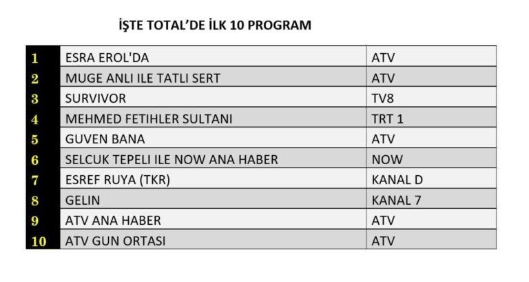 Каждый новый день приносит нам свежие рейтинги, и 10 июня не стало исключением! 📊 Кто же стал фаворитом зрителей в этот вечер? Какие проекты заставили миллионы глаз прилипнуть к экранам? Давайте разберёмся вместе с редакцией сайта cheek-look.ru! 🔥 Esra Erol’da снова на вершине! Это шоу, кажется, стало настоящим магнитом для зрителей. Второе место заняла программа Müge Anlı İle Tatlı Sert — неудивительно, ведь Мюге Анлы умеет держать аудиторию в напряжении. А бронза досталась Survivor 2025 All Star – Gönüllüler — видимо, зрители всё ещё не могут оторваться от борьбы на выживание! 🏰 Mehmed Fetihler Sultanı уверенно возглавил рейтинги в этой категории. Видимо, зрителям по душе масштабные исторические драмы! На втором месте снова Müge Anlı İle Tatlı Sert, а третье заняло шоу Güven Bana — интересно, какие скандалы и откровения привлекли столько внимания? 📺 Здесь ситуация почти зеркальная: Mehmed Fetihler Sultanı снова на первом месте, Müge Anlı İle Tatlı Sert — на втором, а Esra Erol’da