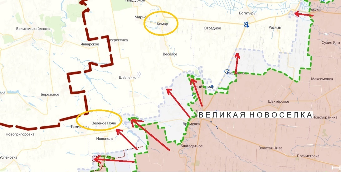 Некоторые наши читатели до сих пор скучают по катку с крыльями и интересуются его судьбой. Что ж, в отличие от наших желаний, каток здесь летит вперёд не так быстро, как мы надеялись. Причина этому банальна - отсюда были сняты некоторые силы и переброшены туда, где сейчас крупные успехи: Однако, пусть здесь у наших успехи не столь быстрые, но зато красивые, если так можно выразиться. Сейчас расскажем, как тут всё повернулось. Где-то месяца полтора-два назад здесь образовалась такая ситуация, что перед нашими встали две основные задачи: Это освободить Комар и двигаться на запад через Зелёное поле. И если к Комару мы продвигались, пусть и не так уж активно, как когда-то шли к В.Новосёлке (тут аналогичный ландшафт, движение вдоль реки, на которой стоят сёла к конечной цели). А вот при движении на запад наши завязли. Наверное, многие могли ехидно шутить про летящий каток, который вдруг остановился, но не спешите с выводами. Противник отчётливо понимал, куда будут двигаться наши. Они имели