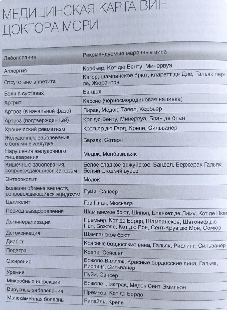 Я наткнулся на уникальный документ, который вызывает интерес и надежды у любителей вина, а также лёгкое беспокойство у врачей. ⠀ Это — «Медицинская карта вин доктора Мори», где каждой болезни полагается свой сорт вина или регион, где этот сорт произрастает. Не думаю, что этой карте вин можно слепо доверять, но давайте посмотрим, что же «прописывает» доктор Мори своим пациентам и найдем некоторые вина в популярных российских сетевых магазинах! Вдруг это реально помогает? Что есть от аллергии в Перекрестке? 1) CORBIERES BESTIAL Тихое. Сухое. Красное. Страна: Франция, Корбьер Сортовой состав: Сира, Гренаш, Мурведр. 2) LE GRAND NOIR CABERNET SAUVIGNON Тихое. Полусухое. Красное. Страна: Франция, Лангедок‑Руссильон, Минервуа Сортовой состав: Каберне Совиньон, Сира. ⠀ Что есть от отсутствия аппетита в Ашане? 1) GRUET SELECTION Игристое. Brut. Белое. Страна: Франция, Шампань Сортовой состав: Пино Нуар, Шардоне, Пино Менье. 2) CAHORS PIERRE CHANAU Тихое. Сухое. Красное. Страна: Франция, Юго-За