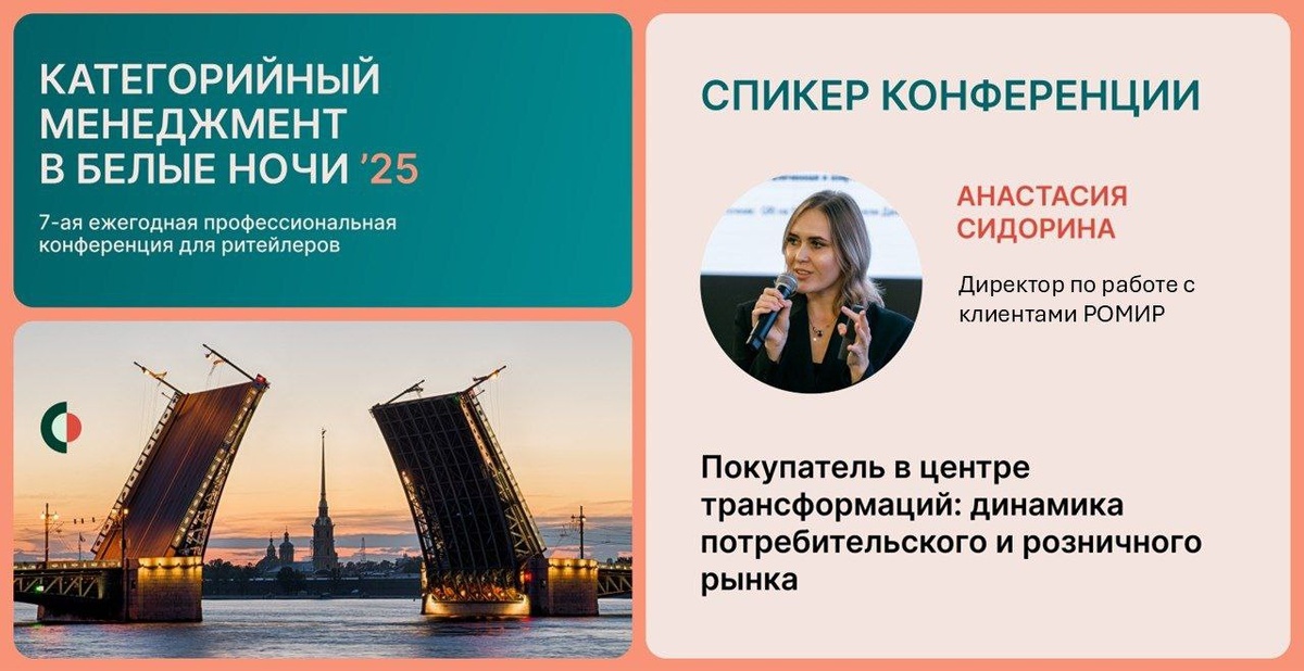 26-27 июня в Санкт-Петербурге состоится конференция «Категорийный менеджмент в Белые Ночи ’25» — мероприятие, где ритейлеры и эксперты обсуждают тренды, стратегии и реальные кейсы для изменений и улучшений бизнеса. В течение 2-х дней более 25 спикеров из сферы ритейла поделятся своими знаниями и опытом применения практик категорийного менеджмента. А также мастер-классы, дискуссии и нетворкинг во время прогулки на теплоходе. Директор по работе с клиентами РОМИР Анастасия Сидорина выступит с эксклюзивными данными и свежими исследованиями на тему "Покупатель в центре трансформаций: динамика потребительского и розничного рынка" Забронируйте участие по выгодной цене на сайте с промокодом Romir — скидка 20% от текущих цен! До встречи на Белых ночах!