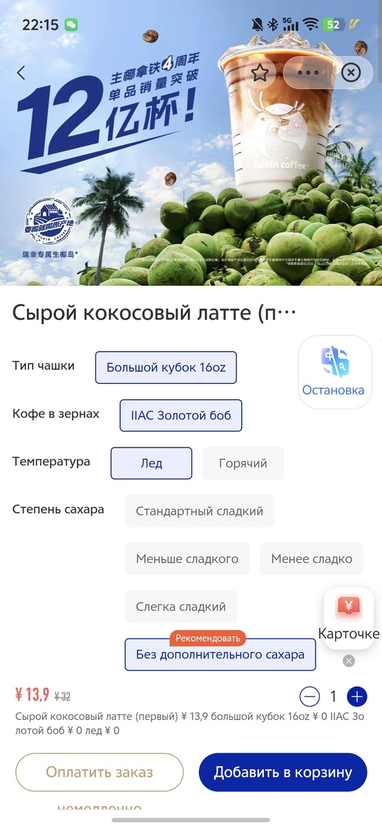 Необычайный вкус и стиль Начнем с того, что кофе я люблю, и очень. Не чёрный конечно, но кофе с молоком (латте, раф, копучино) это тоже считаю за кофе. В Китае мне открылся необычный, новый вкус напитков ( и десертиков) Пока этот челендж по кофейням я только открываю. Могу выделить, что точно стоит попробовать: LuckinCoffe : Кокосовый латте У них он выглядит и переводится так 😄: Первый заказ вместо 13.9 юаней= 159 рублей вам обойдётся по лояльности на 9 юаней = 103 рубля . Очень советую совместно взять банановый чизкейк, сразу возникла любовь к этому союзу. Кофе на удивление по вкусу горячий и холодный- разные по вкусу. Рекомендовьен попробовать оба варианта. Кстати сеть у этой кофейни достаточно большая по покрытию, их вы точно найдете в любом городе. Здесь думаю все стандартно Вкусный кофе , но не более, без изюменки, и дорого! В сравнении конечно . Есть кофе и подороже, например Lime Coffee. Здесь континент фрилансеров с макбуками. Для меня лично был новинкой чай. В чайных ту