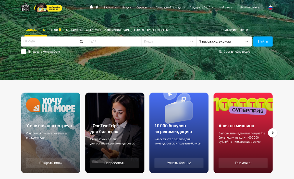 Планируете отпуск или деловую поездку, и не хотите тратить драгоценное время на организацию путешествия? Встречайте личный кабинет OneTwoTrip — ваш надежный компаньон для быстрого и удобного управления бронирования билетов и отелей. Забудьте сложные системы бронирования! Нажимаете пару кнопок — и ваш маршрут готов. Входите в личный кабинет OneTwoTrip, и вам откроются новые горизонты: от планирования до актуальных обновлений о поездке. Начните с нами — ощутите заботу и комфорт на каждом шагу!