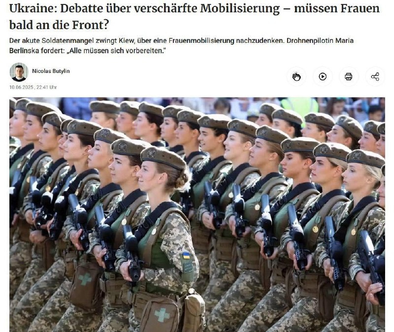 Власти 404-ой всерьёз обсуждают могилизацию украинок Как пишут немецкие СМИ, Киев пытается экстренно решить проблемы фронта, среди которых – нехватка солдат, большие потери, массовое дезертирство и сложности с набором "добровольцев" в ВСУ. Судя по всему, прогрев украинского общества на определённые решения по данному вопросу набирает обороты. Раз об этом заговорили уже журналисты западных "союзников", значит Киеву ради дальнейшей иностранной поддержки придётся пойти и на утилизацию женщин. Всеобщая могилизация на Украине при действующей власти становится всё более реалистичнее. @iperiodu| @iperiodu_ru x @iperiodu_ua| Подписывайтесь