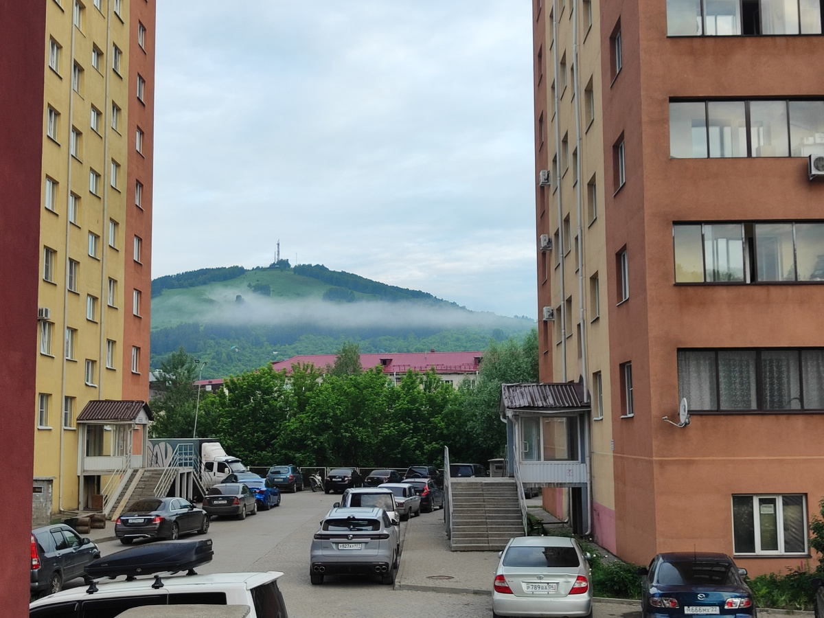 Я все переживала за погоду, которая испортилась и не хотела снова становиться летней и солнечной. Когда вышли из дома, то было облачно, на горе лежали облака.
