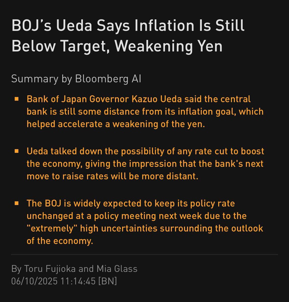 Кажется Япония снова заливает мир дешёвыми деньгами Пока ФРС и ЕЦБ думают, когда снизить ставку, Банк Японии стоит в стороне — и наблюдает, как йена падает. Вот что сказал глава BOJ Уэда: — Инфляция всё ещё ниже цели — Ставку поднимать пока не будут — Рынок ожидает сохранения мягкой политики — А при ухудшении ситуации — возможно даже новые стимулы То есть Япония снова остаётся последней страной с дешёвыми деньгами в эпоху дорогих. Что это значит для рынка? — Уход от ужесточения = слабая йена — Слабая йена = поток капиталов в риск — Возможность нового QE = рост ликвидности Если BOJ не только отложит QT (сворачивание баланса), но и снова включит печатный станок — это будет шагом в сторону раздувания глобального пузыря. Особенно на фоне стагнирующего роста и напряжённости в долларах. Иронично: страна с самым большим долгом и самой низкой ставкой может снова подкинуть дров в глобальный рынок активов. Следим за заседанием BOJ в июне. Это может стать катализатором для: — роста битк