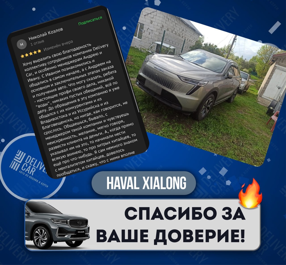 ОТЗЫВЫ ОТ ВАС!🔥📝 Снова делимся приятными отзывами от довольных клиентов, которые купили с нашей помощью HAVAL 🚘 XIALONG MAX и VOLKSWAGEN 🚘 TAYRON из Китая!🇨🇳🤝 Автомобили активно ставятся на учет и радуют своих владельцев! Желаем приятной эксплуатации! Спасибо за Ваше доверие!💙 ⭐️Перейти к отзывам 🌐 Сайт компании: https://доставка-автомобилей.рф 📲 Звонить | 8 (800) 600-46-24 📝 Отзывы о нас: 2GIS | VL.RU 💱 Бесплатный расчет авто: ОСТАВИТЬ ЗАЯВКУ Подписаться на DELIVERY CAR
