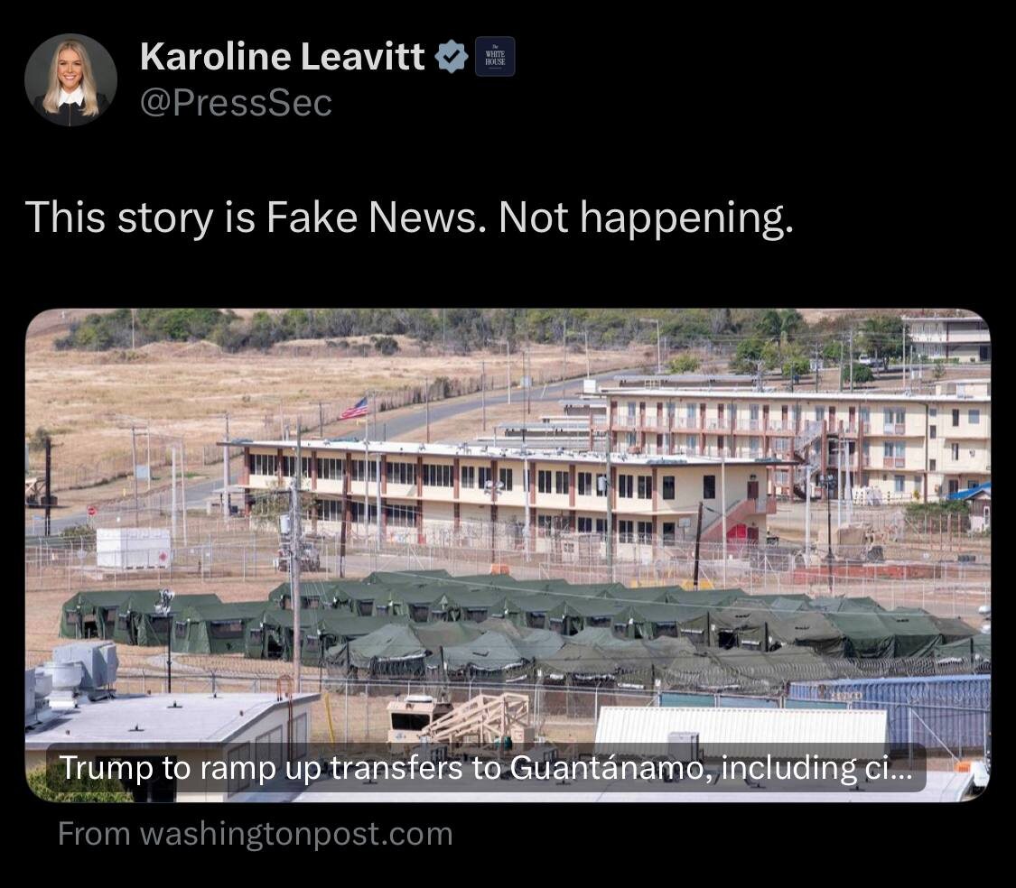 В ответ на пост Ukrainians NOT GOING to Guantanamo — White House WaPo's report on alleged plans by the Trump admin to sent illegals to the Guantanamo base is 'fake news' — Press Secretary Leavitt