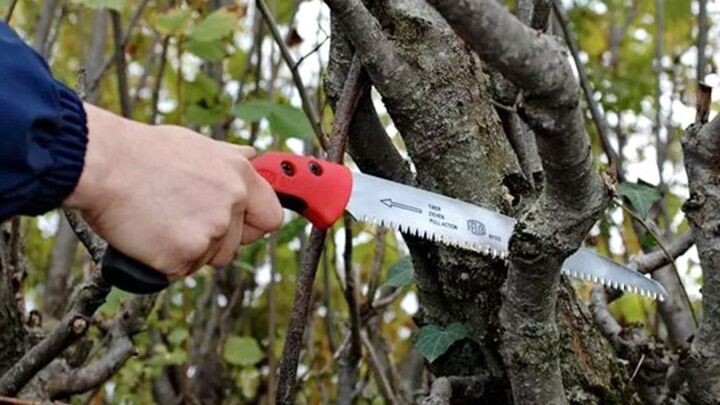 В последнее время при обрезке садовых деревьев всё чаще используют цепные аккумуляторные пилы В предыдущем номере «МОЁ!» мы рассказали, какими ручными пилами удобнее разделывать доски и мебельные щиты. Теперь поговорим о ножовках для опиливания деревьев на даче. Конечно, для этой цели подойдёт и обычная ручная пила. Я, например, опиливая сучья диаметром больше 10 см на липах, клёнах, использую простую, хорошо разведённую ножовку для влажной древесины с длиной полотна 35 — 40 см. Короткий инструмент удобен для работы на высоте, на дереве или с лестницы. Но если работаю с земли или со стремянки, а сучья расположены довольно высоко, то в ход идёт специальная садовая ножовка. Изогнутая форма её полотна помогает быстро отпиливать довольно толстые сучья. Если же они находятся на высоте 2 — 3 метров, то я меняю короткую ручку пилы — здесь предусмотрена такая возможность — на длинную, полутораметровую. Она легко защёлкивается и обеспечивает необходимую жёсткость. Полотно в месте распила почти