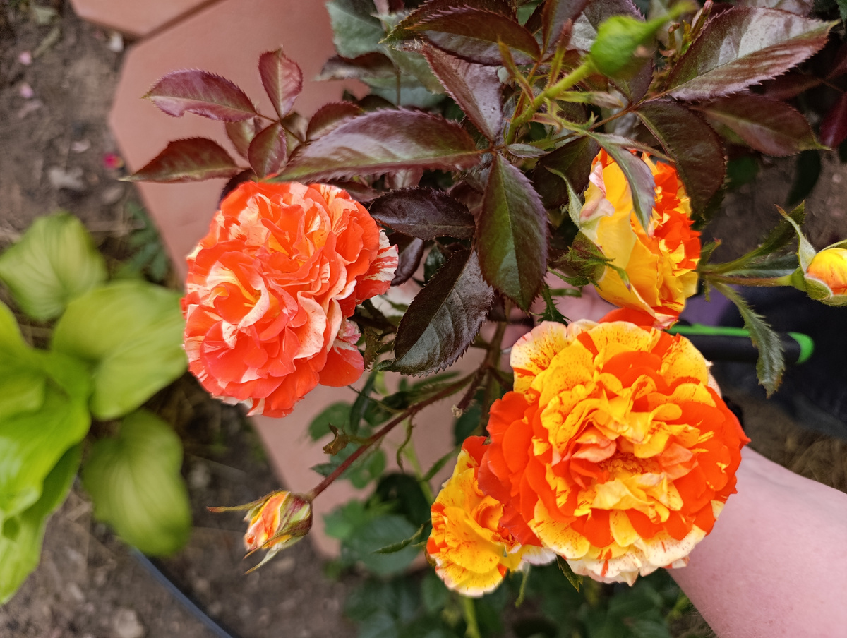 Оранж энд Лемон, роза флорибунда , очень яркая и насыщенная , куст сильнорослый, она у меня второй год,побеги красные большей частью, аромат слабый, но эти помпошки возмещают все, ваша клумба с этой розой не останется без внимания , это точно. В прошлом году она у меня болела мучнистой росой , не устояла. В этом году пока все хорошо.