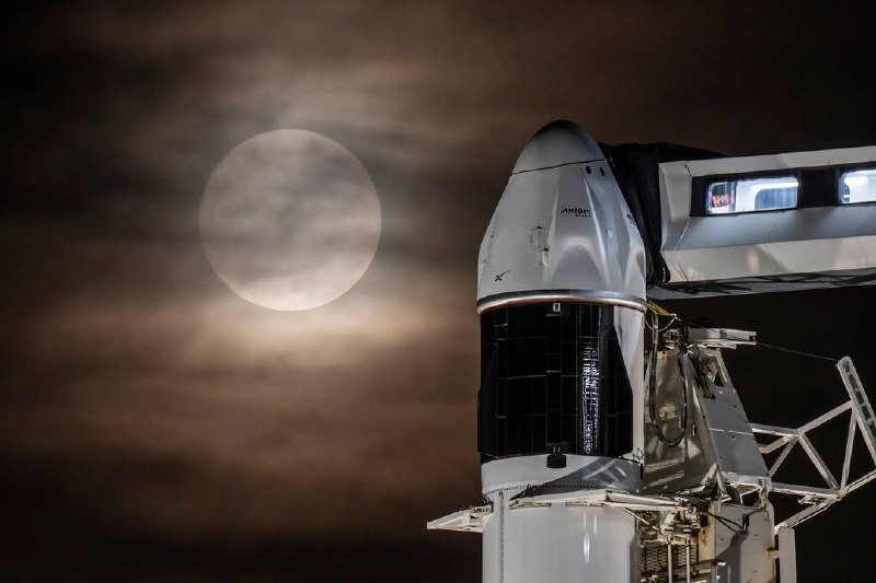 Луна над ракетой Falcon 9 На этом снимке запечатлен восход полной Луны на фоне пусковой установки с ракетой Falcon 9 компании SpaceX. Кадр сделан в момент, когда Луна находилась низко над горизонтом, что придало ей характерный золотистый оттенок. Детали изображения: - Ракета Falcon 9 стоит на стартовой площадке в ожидании запуска - Полная Луна визуально сопоставима по размеру с ракетой благодаря эффекту "лунной иллюзии" - Композиция символизирует связь между космическими исследованиями и небесными телами Такие фотографии демонстрируют гармоничное сочетание космических технологий и природных явлений. Фото: SpaceX #космос #астрофотография #SpaceX #Луна