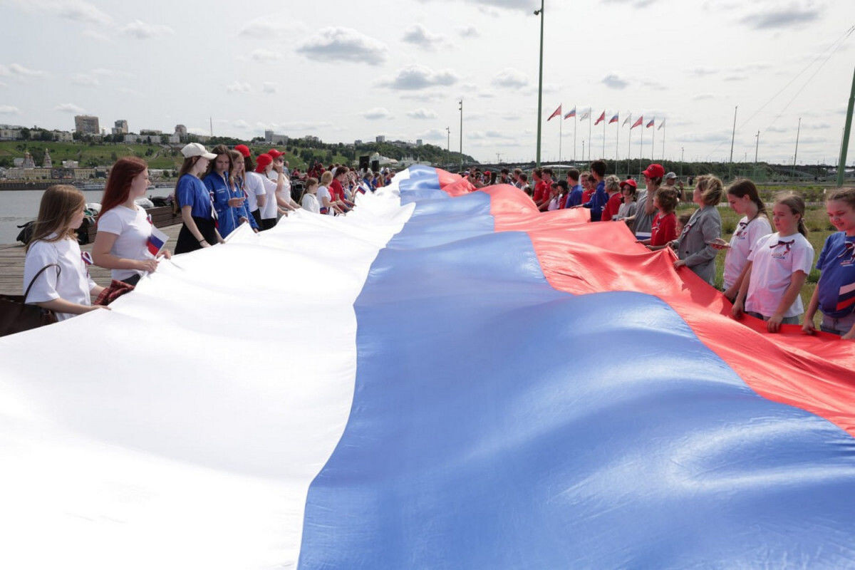 На Стрелке Нижнего Новгорода 500 горожан приняли участие в масштабной патриотическая акции ко Дню России и растянули 100-метровый триколор. Об этом пишет «Время Н». Организовали акцию нижегородское региональное отделение Всероссийского общества «Волонтеры Победы», а также центр патриотического воспитания «Авангард» при поддержке правительства области. На торжественной церемонии присутствовали сенатор РФ Ольга Щетинина, депутат Госдумы Федерального собрания Артем Кавинов, уполномоченный по правам человека в Нижегородской области Оксана Кислицына, министр молодежной политики Нижегородской области Светлана Ануфриева, ветераны СВО, участники байкерских клубов Нижнего Новгорода и области, воспитанники нижегородских школ, активисты молодежных организаций и гости города. «Символично, что празднование проходит на нижегородской Стрелке, в месте силы, где сливаются две великие реки – Волга и Ока, где история и природная мощь края дают нам вдохновение. Как отметил президент страны Владимир Путин,
