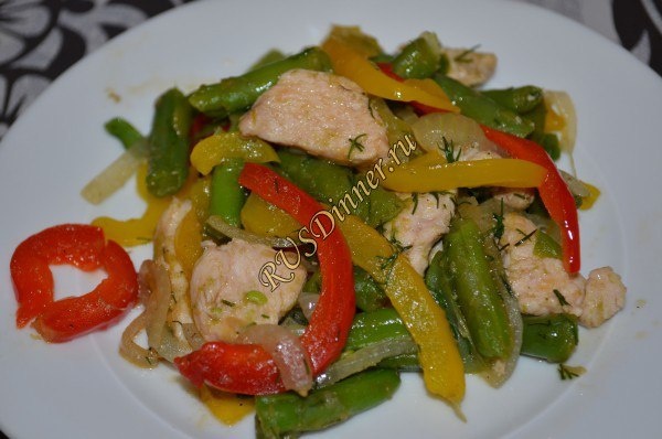 Теплый салат с курицей и стручковой фасолью От автора: Теплый салат с курицей и стручковой фасолью будет кстати, если Вам приелись ваши стандартные салатики и хочется обновить меню. Ингредиенты: Фасоль стручковая - 500 гр. Перец болгарский - 200 гр. Лук репчатый - 1 шт. Куриная грудка - 250 гр. Масло оливковое - 50 мл. Для заправки: Вода - 50 мл. (горячая) Бальзамический уксус - 50 мл. Укроп - 1 пуч. (можно сушеный) Соль - 10 гр. Источник: https://rusdinner.ru/page/teplyj-salat-s-kuricej-i-struchkovoj-fasolju