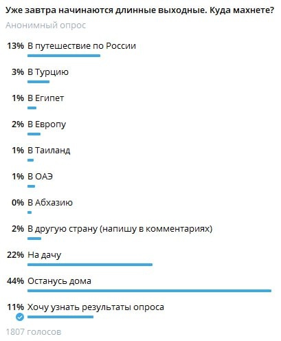 В ответ на пост Ну что ж, вот мы и узнали, кто куда махнет на предстоящих выходных. Как выяснилось, большинство подписчиков никуда не махнет (а некоторые еще и работать будут), и это неудивительно – за 4 дня особо не разгуляешься. Но если очень хочется, то можно отправиться куда-нибудь поближе – на дачу или в путешествие по России, например по городам Золотого кольца. Эти варианты ответов вошли в призовую тройку. Нашлись и любители острых ощущений – те, кто отважится на моноколесе выехать в сторону Подмосковья. Вы там держитесь! Ну а дальние путешествия на такой короткий промежуток времени готовы выбирать не все – лишь 7 человек из сотни. А вот удлинить свой отпуск на 4 дня благодаря июньскому празднику некоторые очень даже не против. Подробнее написали на ТурДоме. @tourdom