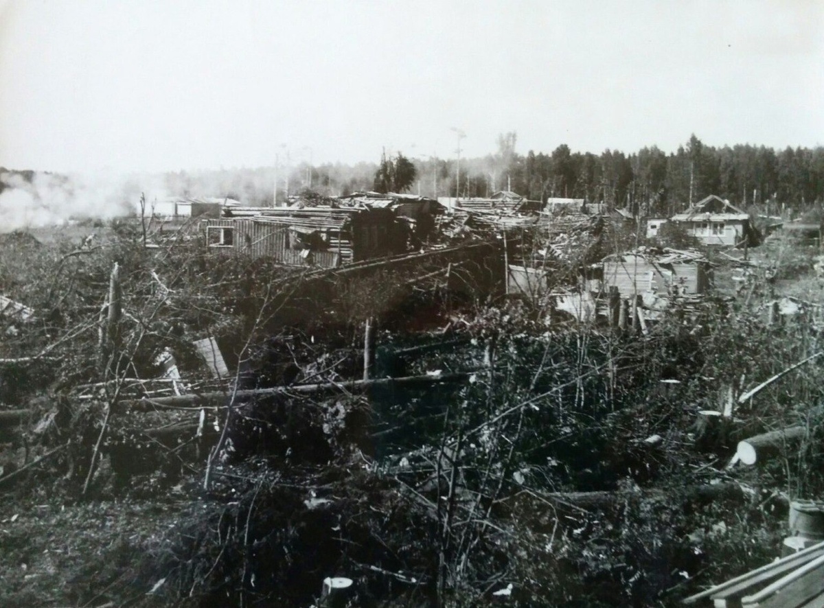 ИВАНОВСКИЙ СМЕРЧ В КОСТРОМСКОЙ ОБЛАСТИ 9 июня 1984 года по правобережью Костромской области пронёсся чудовищный смерч. В этот день из-за столкновения воздушных масс образовалась не одна, а 7-8 воронок. Наш смерч начался в 15 километрах от Иванова, на границе поля и леса. Сам город он прошёл западной окраиной и двинулся к Волге. Волгореченск обошёл, а всю оставшуюся силу выместил на турбазе Лунёво. Вихрь косил всё на своём пути в полосе около пятисот метров. Скорость вращения по часовой стрелке в центре воронки достигала 100 метров в секунду. «Будто подрубленные, падали мощные опоры ЛЭП, вековые деревья ломало, как спички, швыряло автомашины. 150-кубометровую стальную емкость для воды подняло в воздух на добрую сотню метров и унесло за километр» – писала газета «Известия» о событиях в Костромской области. Свидетели рассказывали: «Один из дачников, очнувшись от удара, обнаружил, что вместо линолеума лежит на голых досках. У другой дачницы смерч унес крышу, разрушил дом, но остался ши