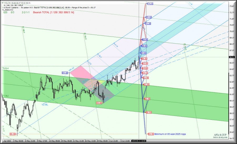 Движение #CL-h4 с 12 июня 2025 года будет обусловлено отработкой и направлением пробоя границ зоны равновесия (66.20 – 67.00 – 68.00) восходящих вил младшего операционного масштаба Minuette-h1