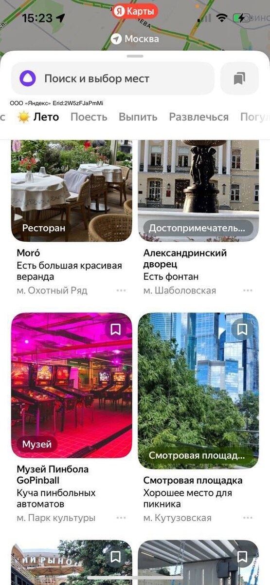 Яндекс Картами я пользуюсь примерно каждый день, и то и дело нахожу там что-то новое. Вот сегодня, например, увидел персональный сценарий "Лето" в меню выбора мест, рядом с разделами "Поесть", "Погулять" и так далее. Там меня (и вас), само собой, ждет подборка разных летних радостей – парков, веранд, аренды сапов и лодок и прочего. Но набор этот совершенно небанальный и нестандартный и, как всегда, подстраивается под ваши личные интересны и запросы. Я вот открыл – и сразу обнаружил музей пинбола на Парке Культуры, как и сто лет назад прекрасную, в японском духе веранду во дворе Noor Electro, настоящие заросли, в которых можно посидеть с бокальчиком на крыше ресторана "За крышей" и еще кучу всего. Лишнее напоминание, что пора торопиться, потому что, вообще-то, почти 2 недели лета уже прошли!